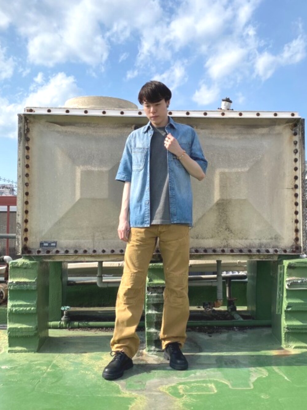 ワークテイストのデニムシャツは、合わせるボトムスを選ばない万能アイテムです。フェード加工のTシャツとブラウンの立体裁断ジーンズでヴィンテージライクなコーデの完成です。