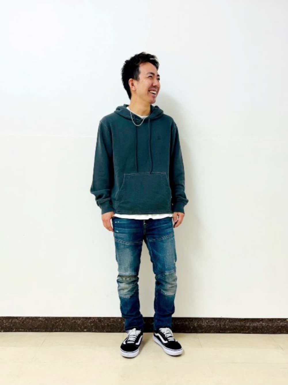 くすみのあるグレーのパーカーにG-Starらしい立体裁断デニムを合わせました。細いパンツを選ぶことでカジュアルになりすぎないスタイルにしています♩