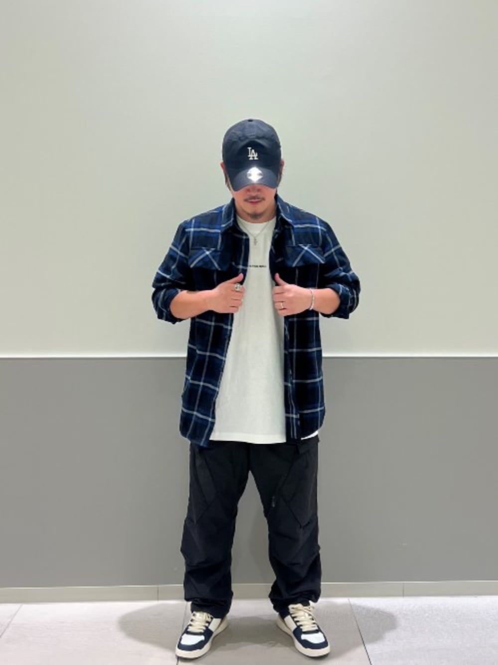 全体的にゆったりワンサイズアップさせたリラックスコーデ。