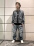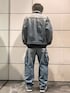 長すぎない丈感に少し緩めのシルエットが今っぽいデニムジャケットは、フロントの斜めシーム・バックのショルダーパネルに織テープを使って他にはないデザイン。 同系色のデニムカーゴと合わせてワークテイストのセットアップ風コーディネート。