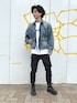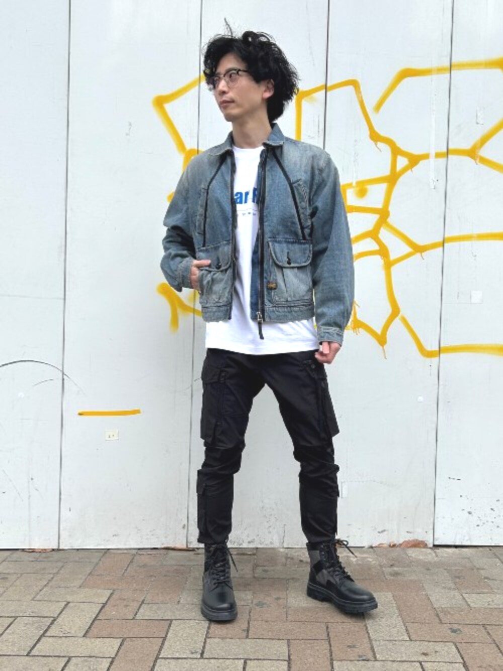 ゆったりリラックスしたシルエットのデニムコーチジャケットをメインにコーディネート。 スリムシルエットのカーゴパンツを合わせてメリハリのあるシルエットに。