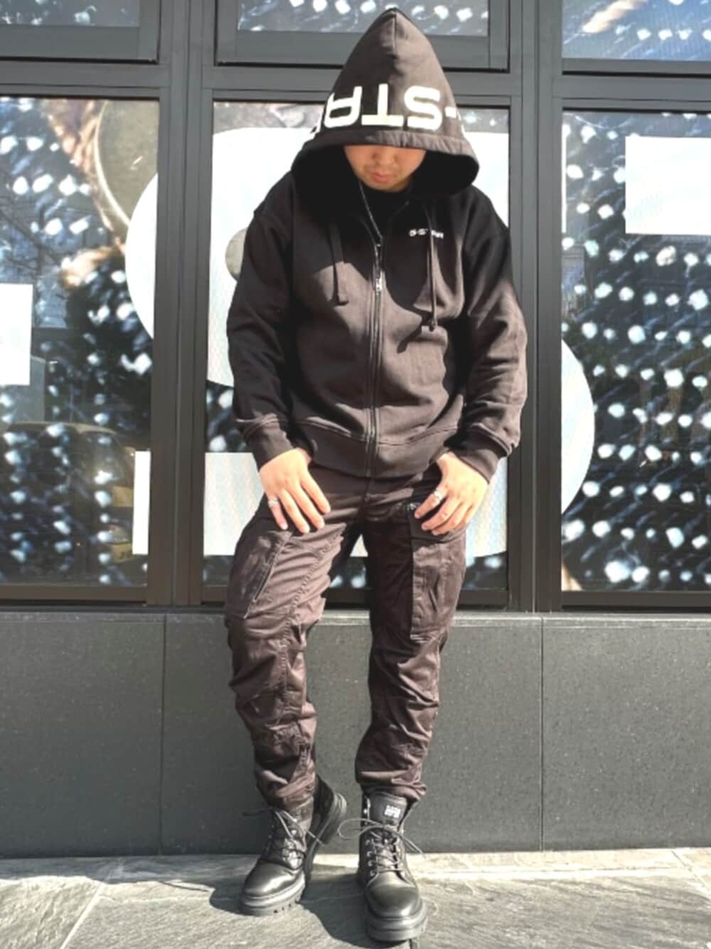 限定パーカーを使った、ブラックのワンカラーコーデ。フードのロゴがアクセントに。