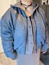 Aラインジップが目を引くボンバージャケット。 オーバーサイズなので、男性にも着ていただけるアイテム。 女性はミニワンピやスカートで合わせるとバランスが良いのでおすすめです。 ゆとりのあるシルエットなのでインナーは多少ボリュームのあるアイテムでもGood。
