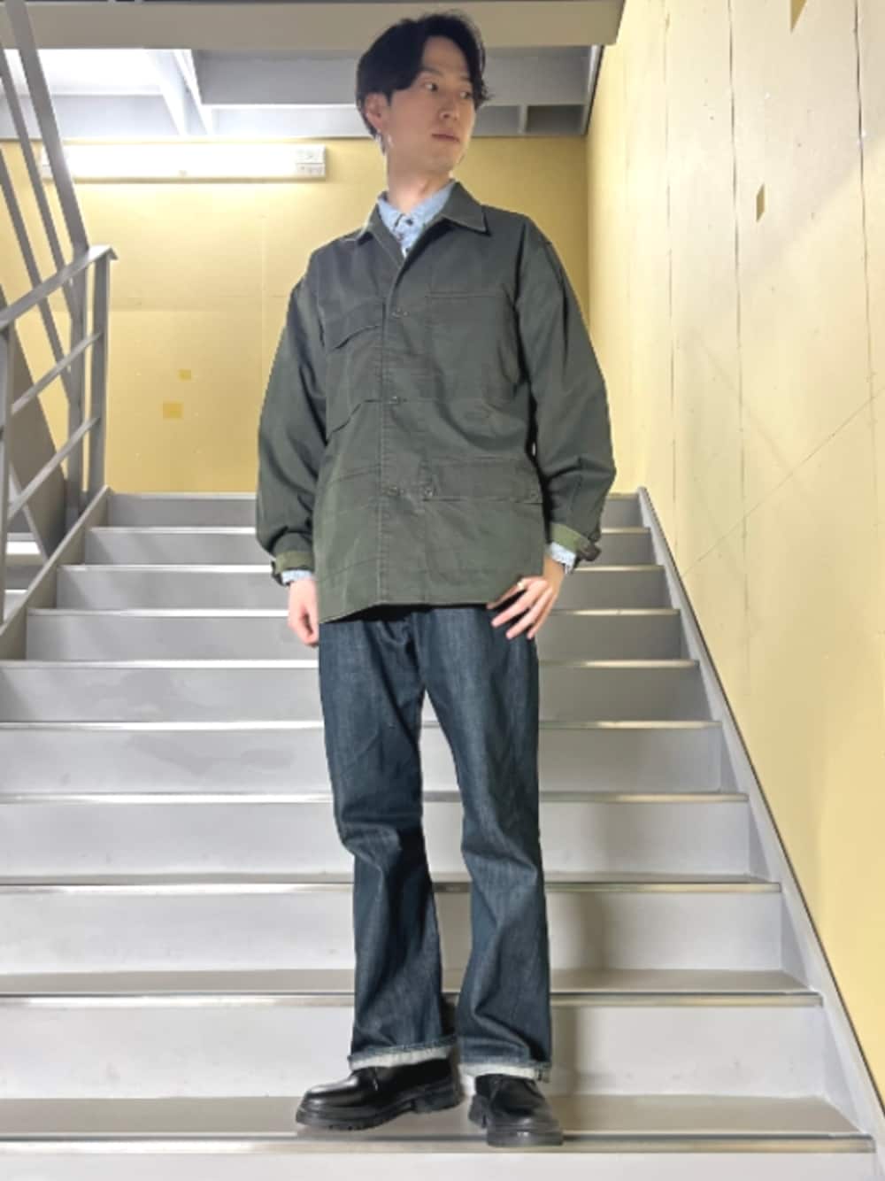 オリーブと迷彩のリバーシブルシャツとNEO RAWデニムを合わせたことでミリタリー感を出しつつ、クリーンな革靴を履くことで綺麗目な要素も取り入れました。