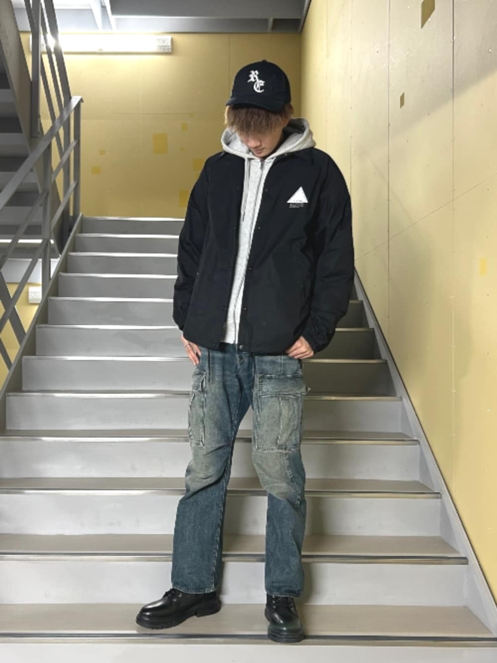 春先に重宝するコーチジャケットにミリタリーライクなステンシルが特徴のジップパーカーをインナーにし、ジーンズはG-STARらしい立体裁断のカーゴを合わせたカジュアルコーデ。