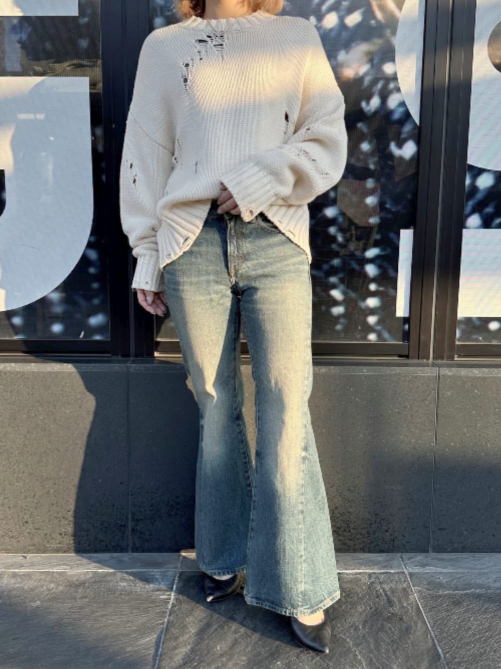 ダメージ加工とリラックスしたオーバーサイズシルエットが特徴のコットンニットにG-STARらしい3Dフレアジーンズを合わせたシンプル大人カジュアルコーデ。