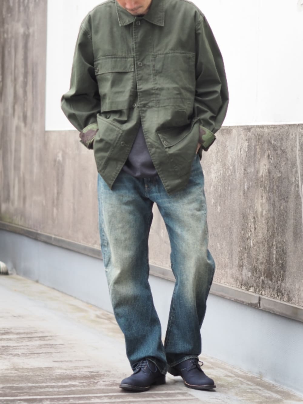 今時期にちょうど良いミリタリーディテールのリバーシブルシャツジャケットに、G-STARの代名詞である立体裁断のストレートジーンズを使った大人カジュアルスタイル。ジャケットの裏側がカモフラ柄なので袖口をまくってアクセントに。