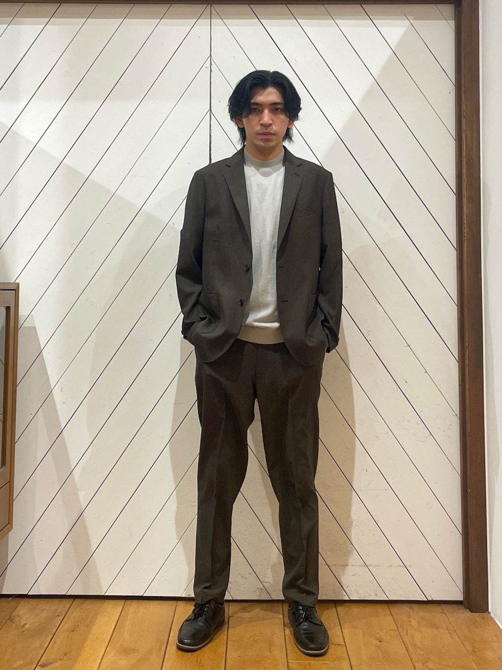 ジャケット ■デザイン ・リラックス感がありながらすっきりとしたシルエット ・フロントシングル2ボタン ・パッチポケット ・センターベント ・ノッチドラペル ・背抜き仕様 ・首元の馴染みを良くするカラークロス仕様 ■素材 さらりとした生地感の麻調のポリエステルを使用。 ストレッチ性に富んだ生地を使用することで抜群の動きやすさがある為、気軽にストレスなく着て頂けます。 ウォッシャブル(手洗い)対応でご自宅での洗濯が可能。 素材感 透け感 : なし 伸縮性 : ややあり 裏地 : あり 光沢 : なし ポケット : あり パンツ ■デザイン ・リラックス感がありながらすっきりとしたシルエット ・ノータック ・裾上げ済み(タタキ仕上げ) ・ウエストゴム入り(後ろ半分) ■素材 さらりとした生地感の麻調のポリエステルを使用。 ストレッチ性に富んだ生地を使用することで抜群の動きやすさがある為、気軽にストレスなく着て頂けます。 素材感 透け感 : なし 伸縮性 : ややあり 裏地 : なし 光沢 : なし ポケット : あり ウォッシャブル(手洗い)対応でご自宅での洗濯が可能。