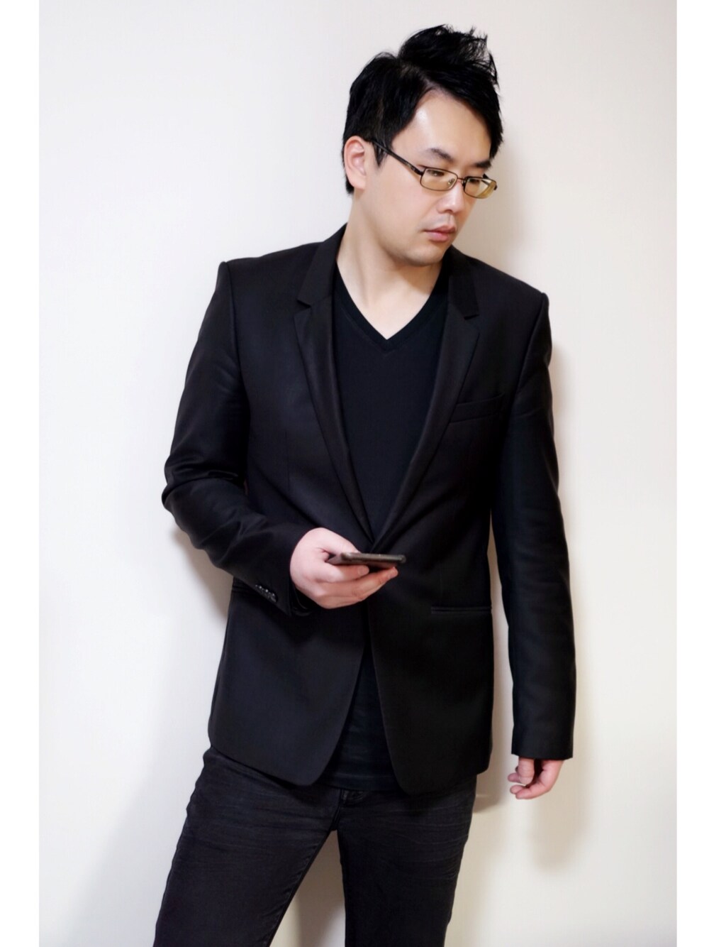 ブラック系のスーツジャケットを着用したメンズの冬コーディネートの1枚目の写真