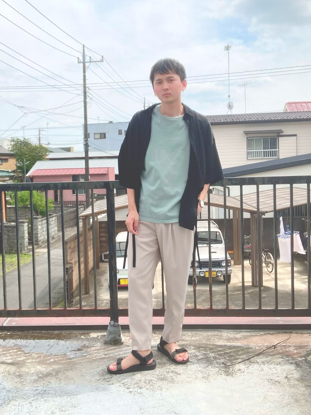 インナーにペールグリーンを入れた 余裕のある大人コーデ。シャツにドローコードがついててクセがあるのが推しポイント! シャツがブラックだから足元も黒のサンダルを持ってきて、コーデを軽くしました --------------------------------------- 💭Size… Shirt:L T-shirt:L Pants:M Sandal:L --------------------------------------- ・item詳細 Shirt:ドレープレギュラーカラードローコードシャツ(ブラック) ✍️ サイドに大きなスリッド(切れ目)があって ドローコードが伸びてるシャツ!これは一目惚れしました。カーゴパンツと合わせてもミリタリー感強めでいいし、普通のスラックスと合わせても様になります! 素材はレーヨンが入っているのでドレープ感が出ており、歩く度にドローコードが踊りまくります🕺 嫌な人は結んでもOK Size感もLで満足です😊