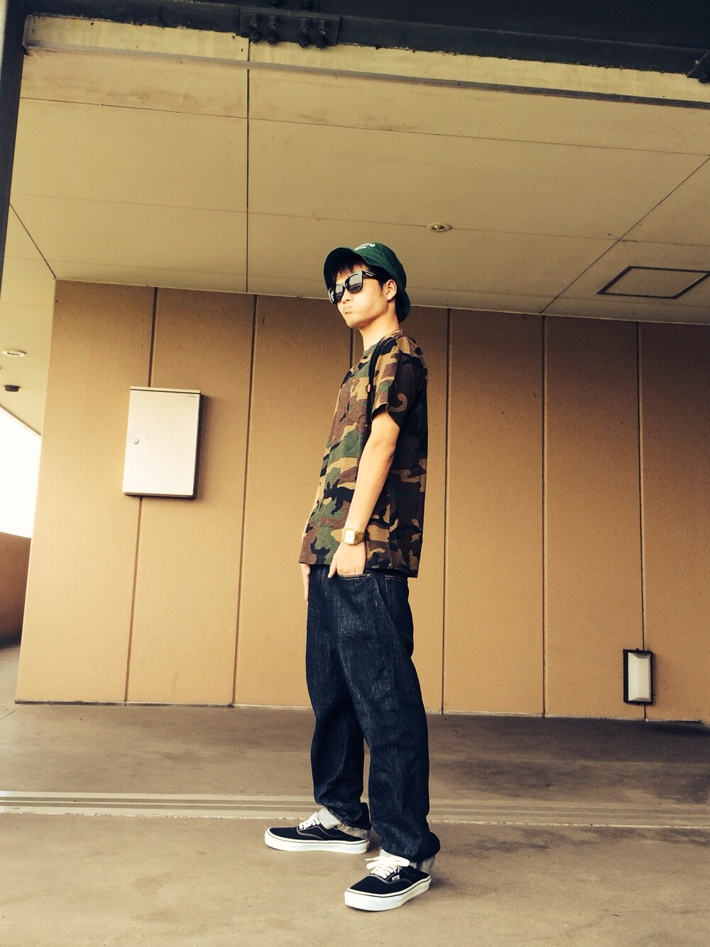ブラック系のスニーカー、グリーン系のハットを着用したメンズの夏コーディネートの1枚目の写真