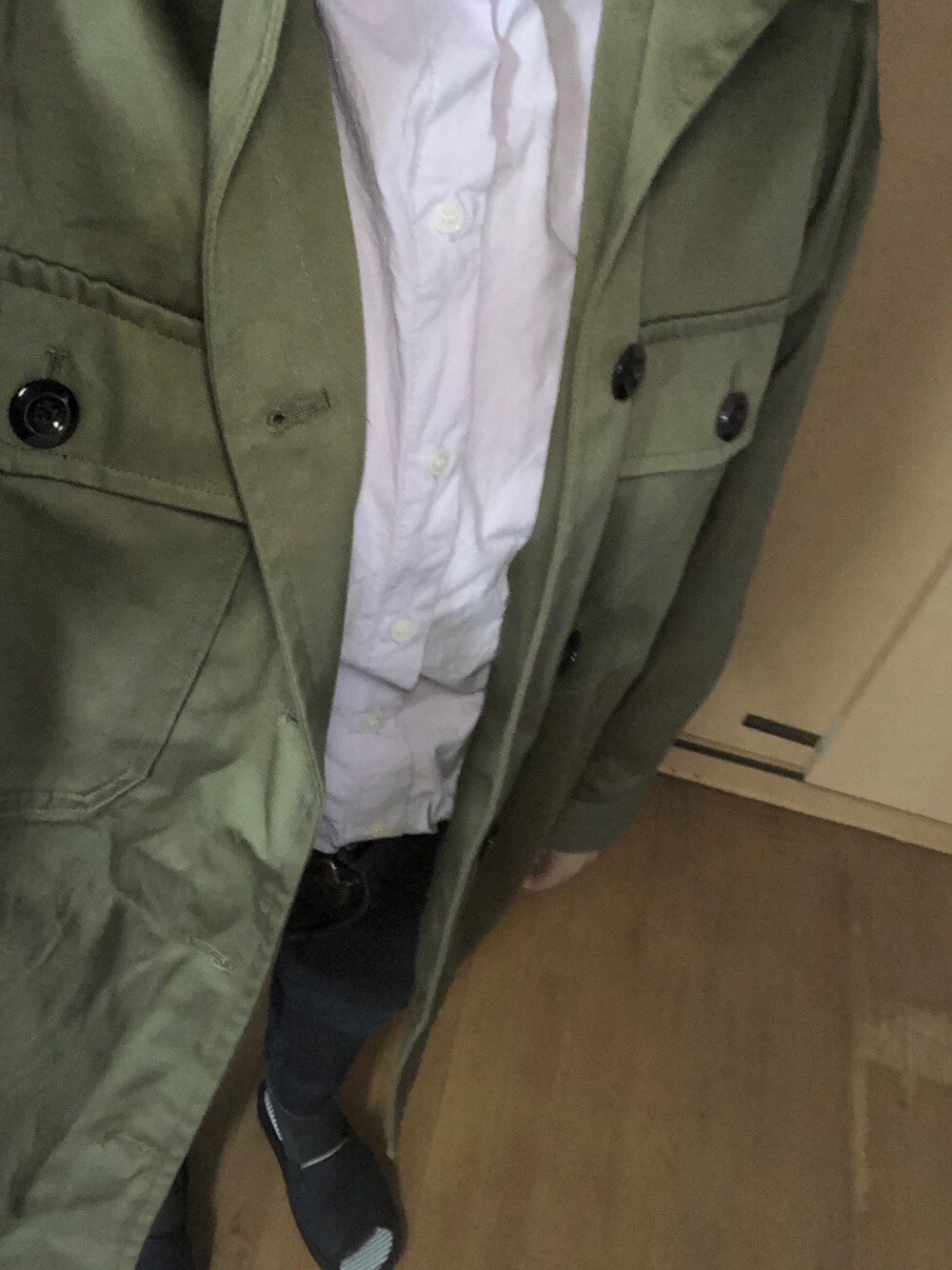 前のコーデにミリタリージャケットを羽織りました。ジーユーのものです。今年の春に買ったものです。 ウエストの紐が取り外しできるので便利です。