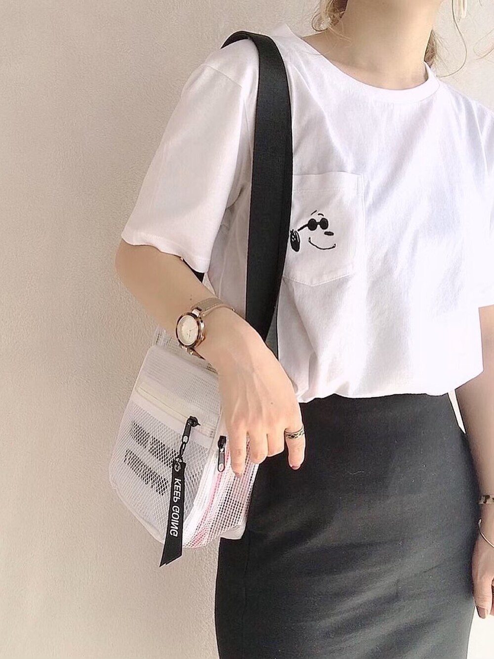 UNIQLOのスヌーピーtシャツがかわいい♡ 黒のタイトスカートでスヌ色コーデ笑 mサイズ着用 ig⏩@___i_am_kze