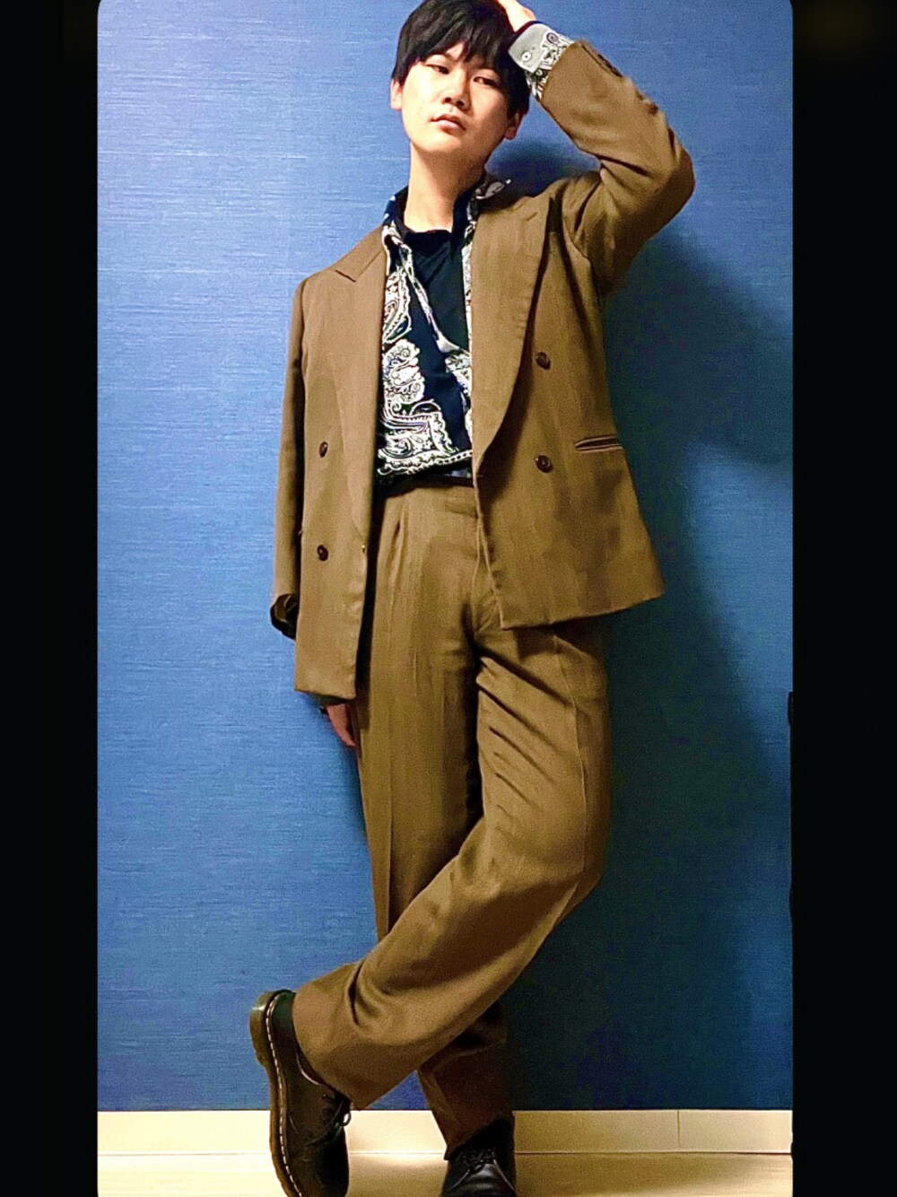 セットアップコーデ### セットアップは35年前ぐらいに父親が着てたやつのお下がりです〜 むっちゃかっこいいわ €こだわりポイント€ セットアップに無地のシャツだと寂しいので 黒のシャツにレイヤーで柄もの入れてます 柄でもモノクロで目立ちすぎないものを 選びました 少し韓流イメージでシャツタックインして脚長感出してます 髪ボサボサだったので手でおさえてます