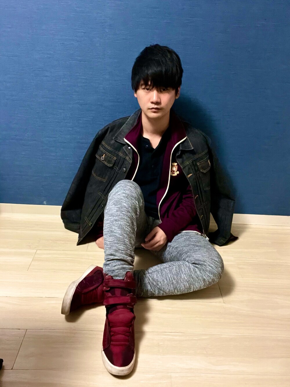 レイヤードスタイルコーデ### 久しぶりにラフなスタイル ジャージにGUのスウェットパンツという 完全オフスタイル シューズは2010年にジャスティン・ビーバーが"Never Let You Go"というMVで 着用していたものです 8年を経て2018年にやっと手に入れたお宝です! €こだわりポイント まずは中心を黒のヘンリーネックで締めて そこから全体的に色のバランスを取ってます また、ジャージとデニムジャケットが 共存できるよう、ジャージの襟を出してます