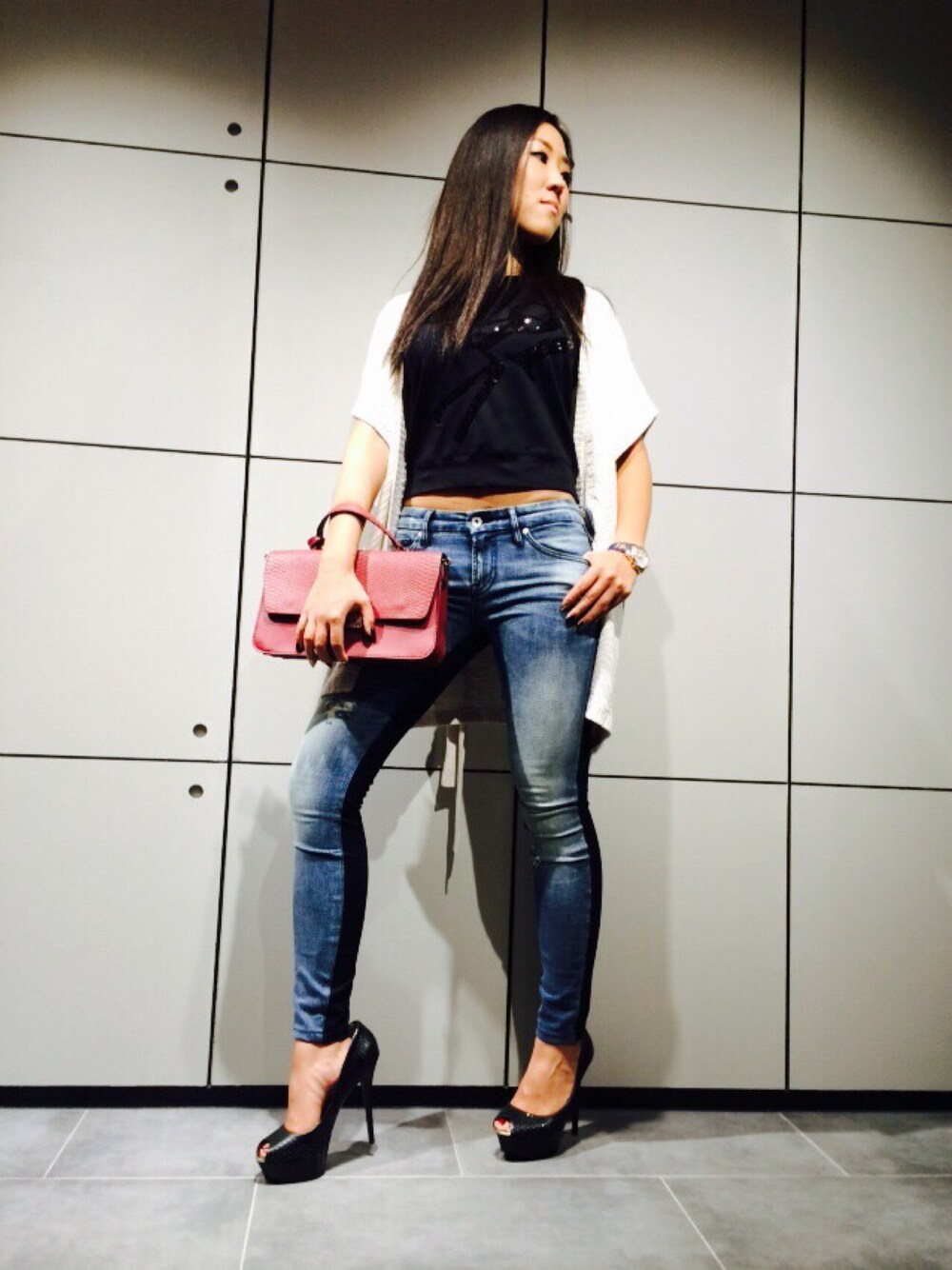 LA発のプレミアムカジュアルブランド GUESS? ゆったりシルエットのカーディガンの中にショート丈のTシャツを合わせたメリハリコーデ。 後ろがブラックのカラーブロッキングスキニーに合わせて全体をコーディネート。ボルドーのBagでカラーをプラス! 【9/17 ZOZO TOWNにGUESS?がOPEN!】 OPENまで、あと7日!