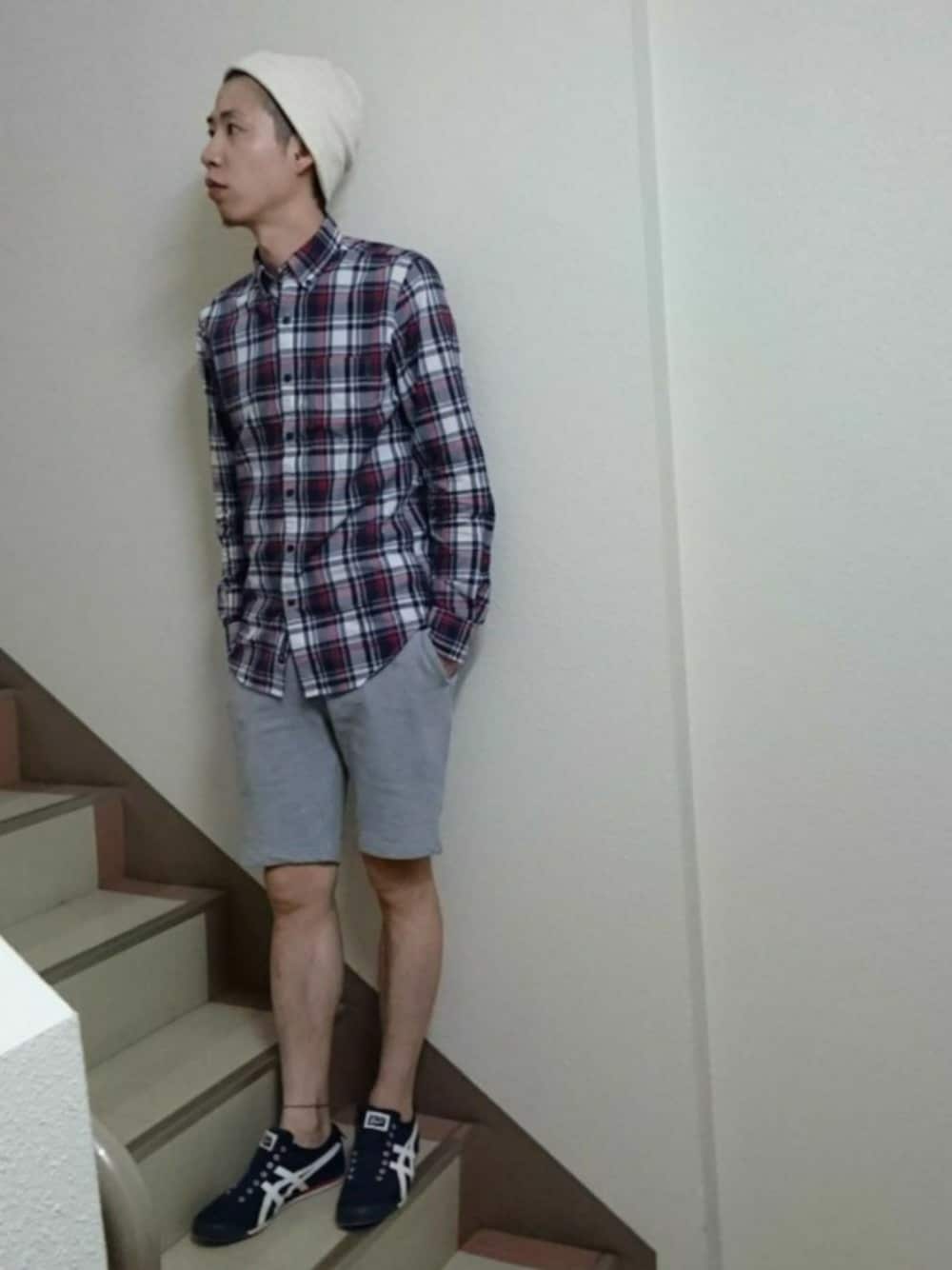 ネイビーコーデ✨ 短パンスウェットに、Tシャツだとラフすぎたので、シャツで大人カジュアル意識😜 フォローさせて頂いてるエポさんの影響でオニツカコーデ😁 久しぶりに、オニツカ履いたけど、やっぱり履きやすいなー🎵