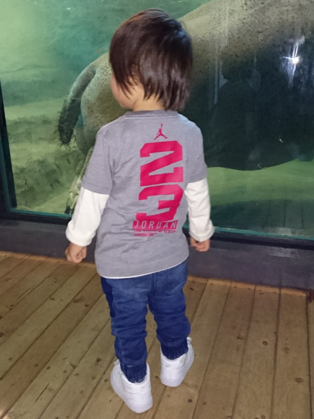 動物園前で、カバの水槽前にて🐘 バックプリントが可愛い❤️ 「男は背中で語る」 たくましいな、息子👦