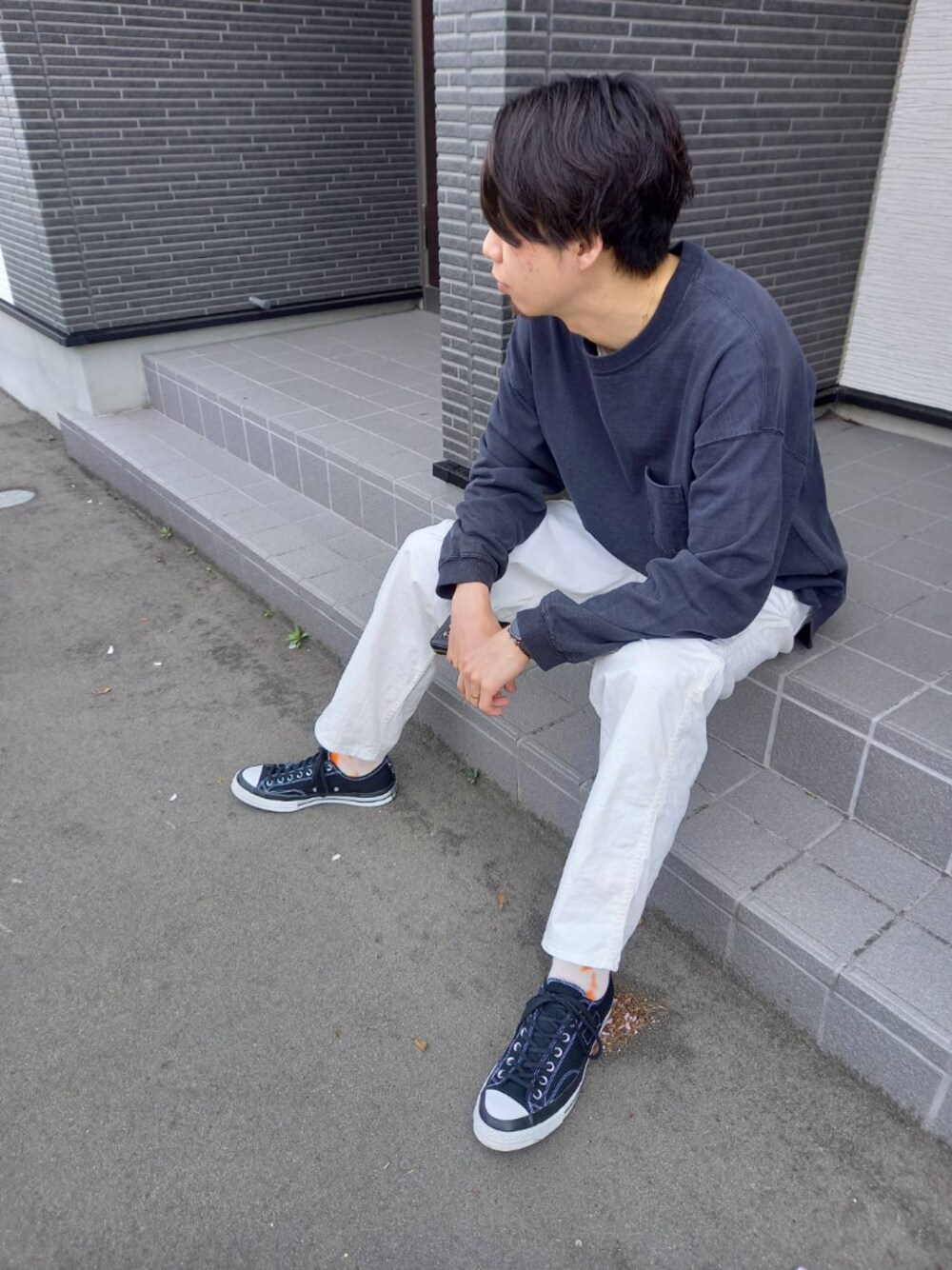 シンプル☀️ モノトーンに、オレンジのムラ染めソックスがポイント👍