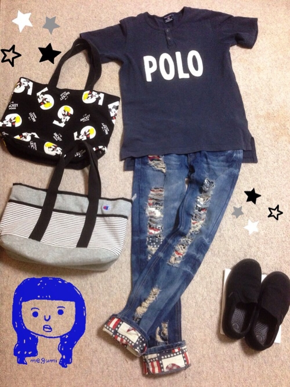 。。。。。* トップスは大のお気に入り。 ジーンズは、アメリカ国旗がチラっと◡̈⃝♩ ∞* トップス/POLO(古着) ボトム/不明 鞄/JOY RICH 鞄/チャンピオン 靴/CROCS