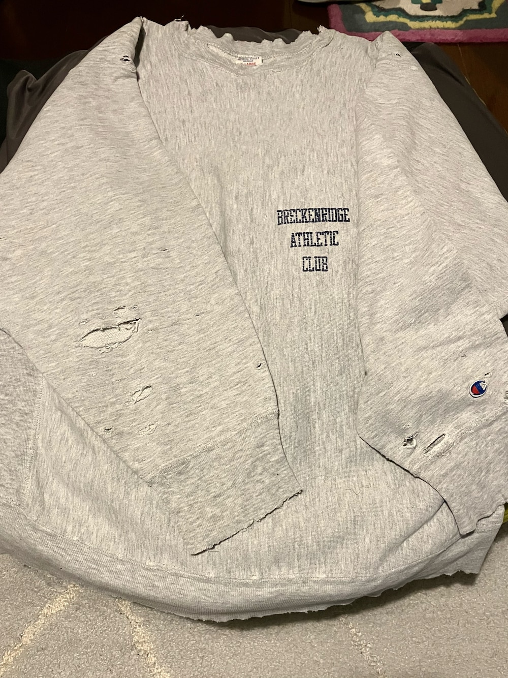 champion1985-1990 のトリコタグ後期らしいです。 もうスウェットの厚みも質感も無くて、身頃もゆがんでて、穴も開きまくりで、袖のリブ折り返し裂けてベローンて。 ただこのプリントの位置とか、そのボロ感ハンパなく好き❤️です。
