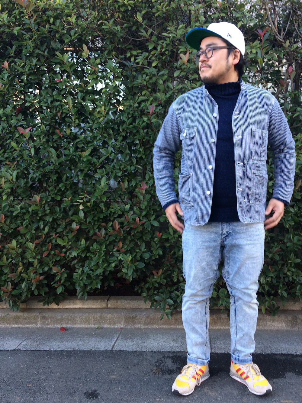 ニューエラのベースボールキャップ。 ドゥニームのノーカラーカバーオール。 ドゥニームのガンジーニット。 ノースフェイスのストレッチデニム。 アディダスのスニーカー。 この格好だと、さすがに寒かったですね。