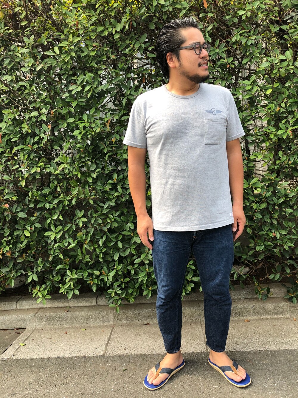 Tシャツジーパン。 ドゥニーム×デラックスのTシャツとジーパン。 ドゥニーム×アイランドスリッパーのサンダル。 グレーのTシャツだったので、汗染みが。 暑い暑いと言ってますが、本当に暑いので皆さんも体調には本当に気をつけてください。