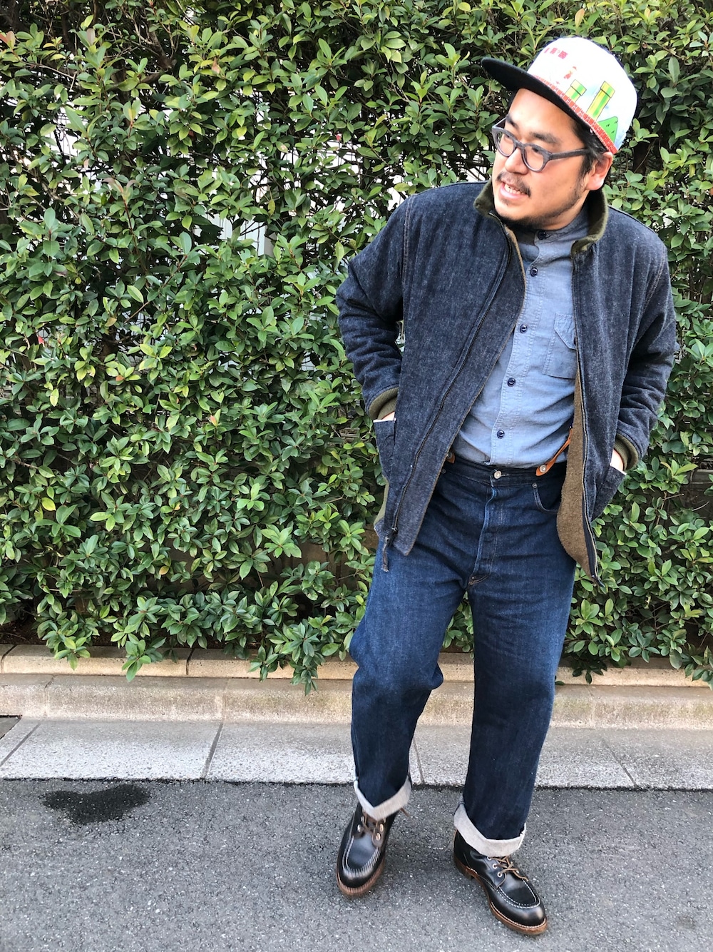 デニムオンデニム。 デニム好きだとどうしてもデニムオンデニムになりますよね。 私たちの世代だとジーパンにレッドウィングは定番。 20年経ってもやってます(笑)