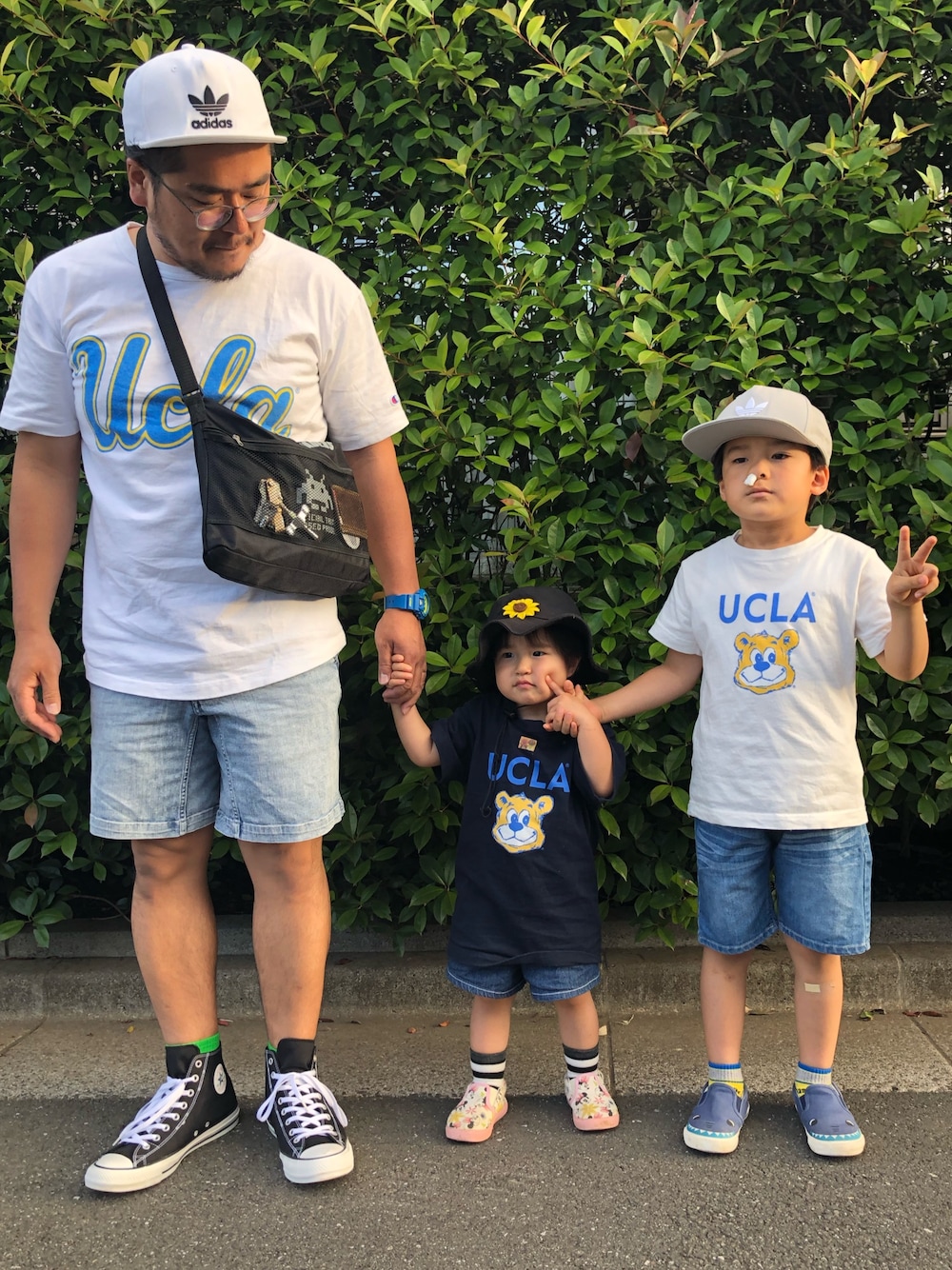 お揃いシリーズ。 アディダスの帽子、 UCLAのTシャツ、 デニムの半ズボン、 娘もUCLA。 鼻血が出ちゃってますが、撮ってくれました(笑)