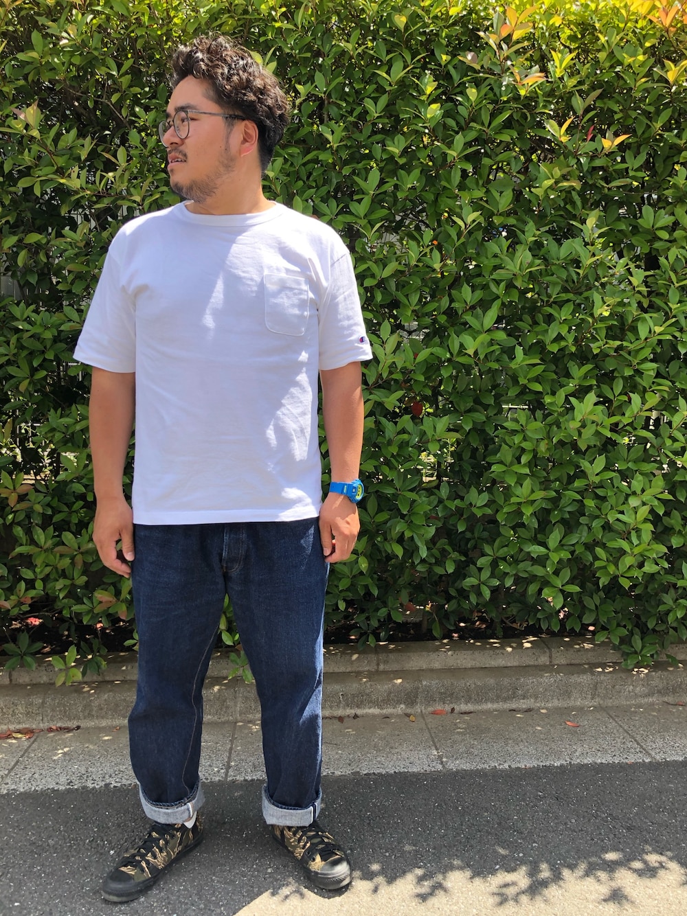 白Tジーパンシリーズ。 チャンピオンのt1011 、 ドゥニームの東京モデル、 バズリクソンズのスニーカー。 上下のサイズ感バッチリかと思います。 東京モデルは細めのストレートなので、オーバーサイズですが、スッキリした印象です。