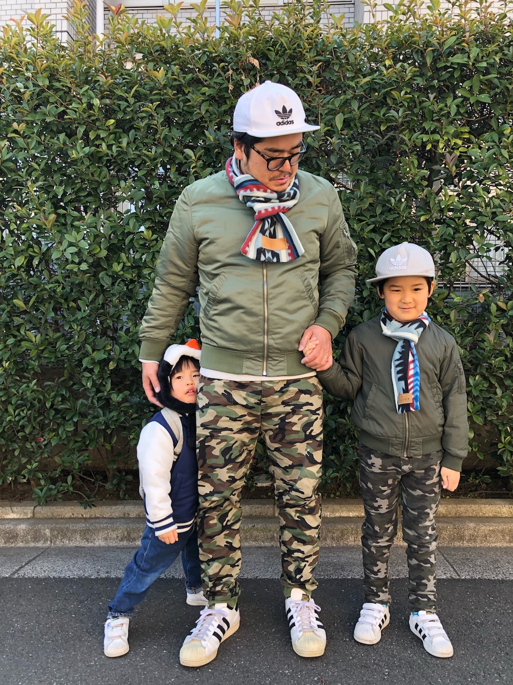 久々の親子3人。 アディダスのベースボールキャップ 、 ma-1、 迷彩のズボン、 スーパースター、 手作りマフラー。 娘はペンギン。 今日のコーディネートは息子がしました! 大人がやるとミリタリー大好きみたいになりますね(笑)