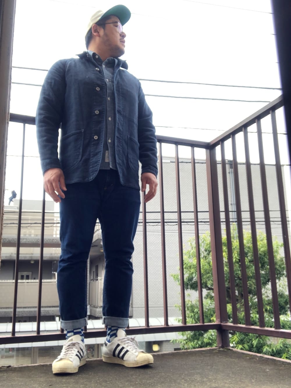 デニムオンデニム。 ニューエラのキャップ、 ドゥニームの カバーオール、シャンブレーシャツ、ジーパン、 スーパースター。