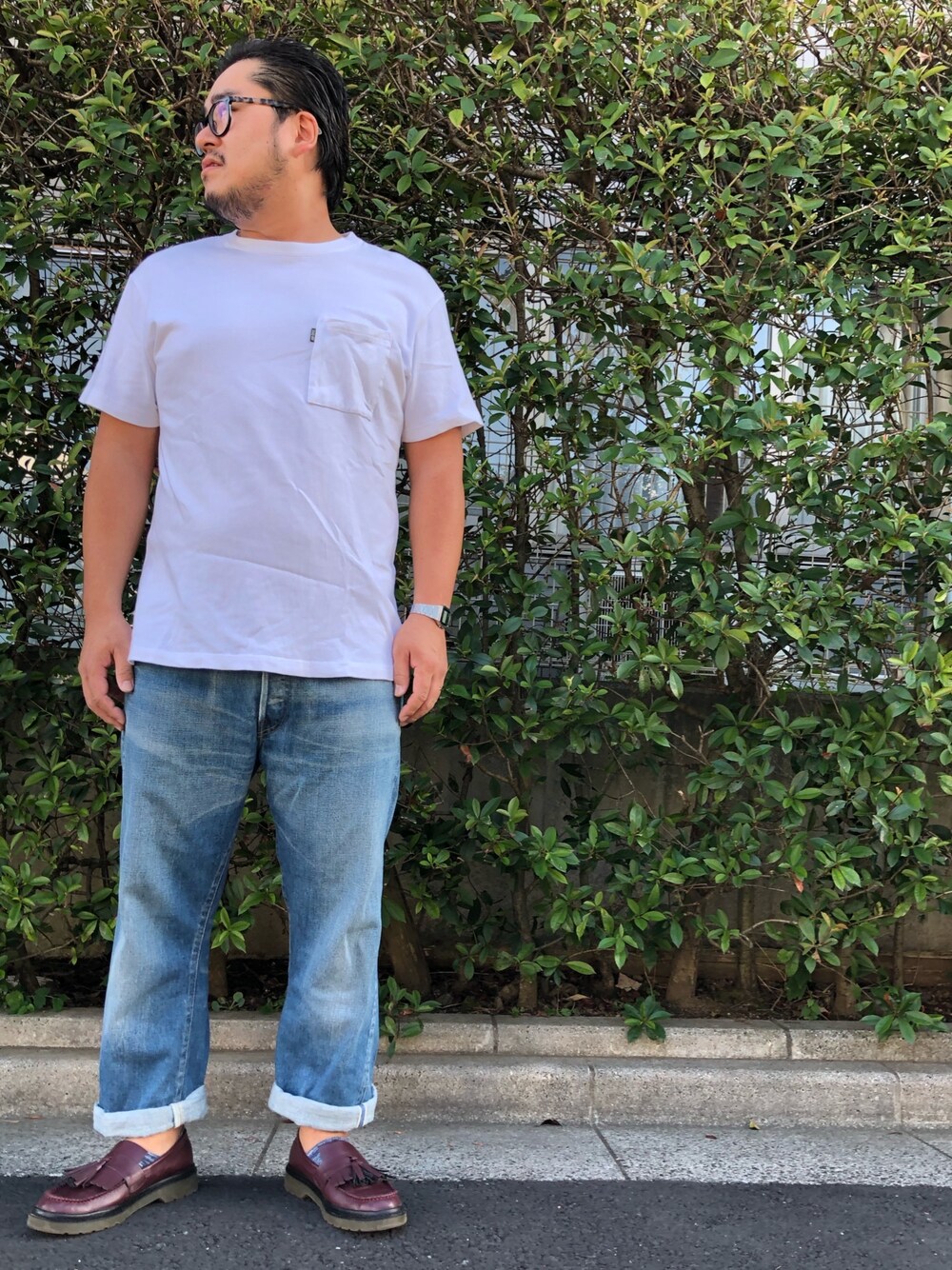 ドゥニーム×ディスカスのTシャツ、 リーバイスの日本製大戦モデル、 グローバルワークのタッセルローファー。