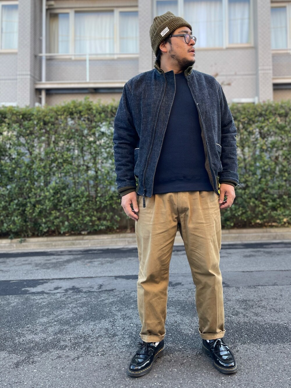 ドゥニームの ニット帽、ワッフルロンT、 ドゥニーム×ヒューストンのタンカース、 フェローズのチノパン、 ドクターマーチンのローファー。