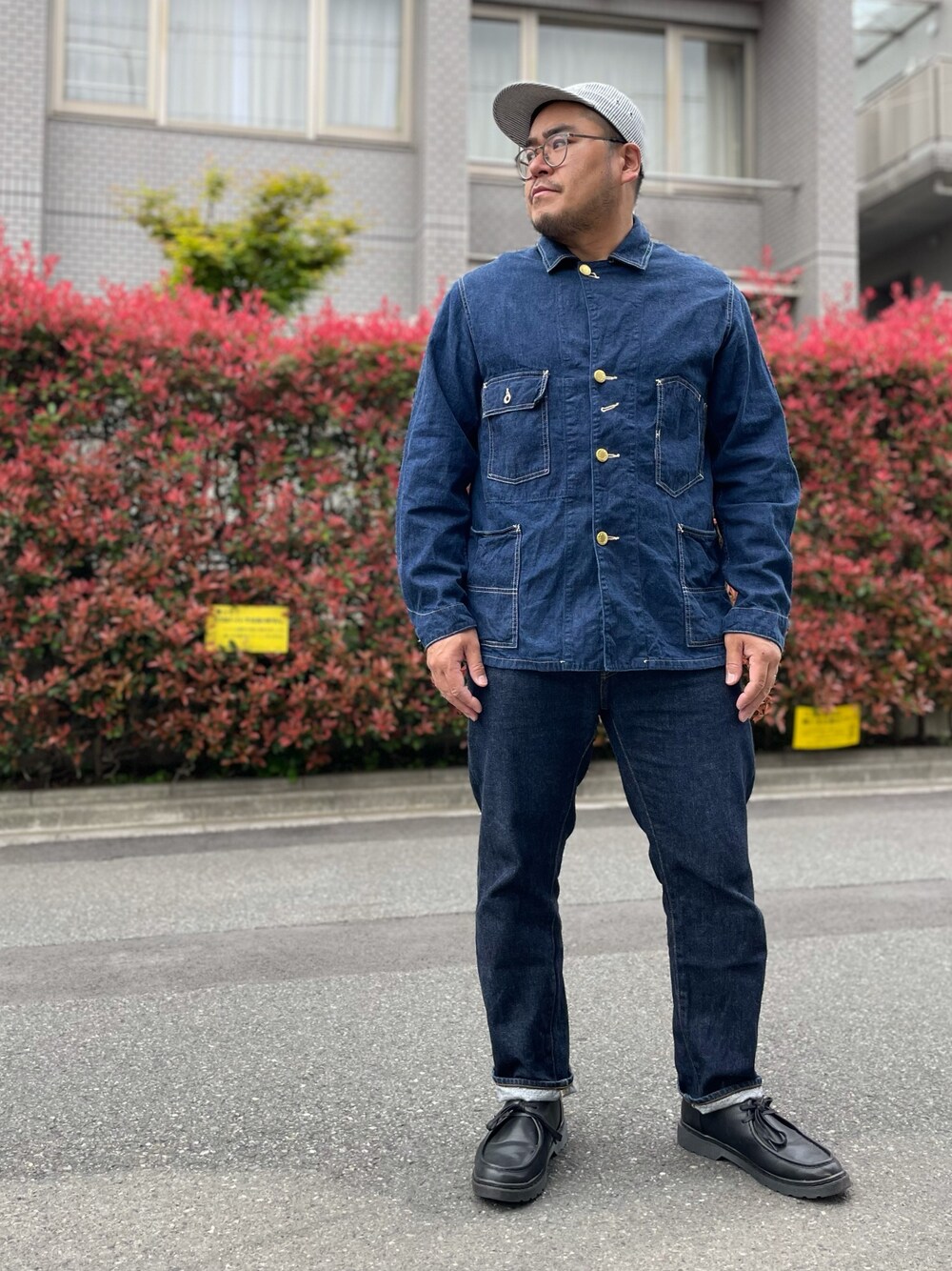 ドゥニームの帽子、 フルカウントのカバーオール、 ユニクロのジーパン、 WEGOのチロリアンシューズ。