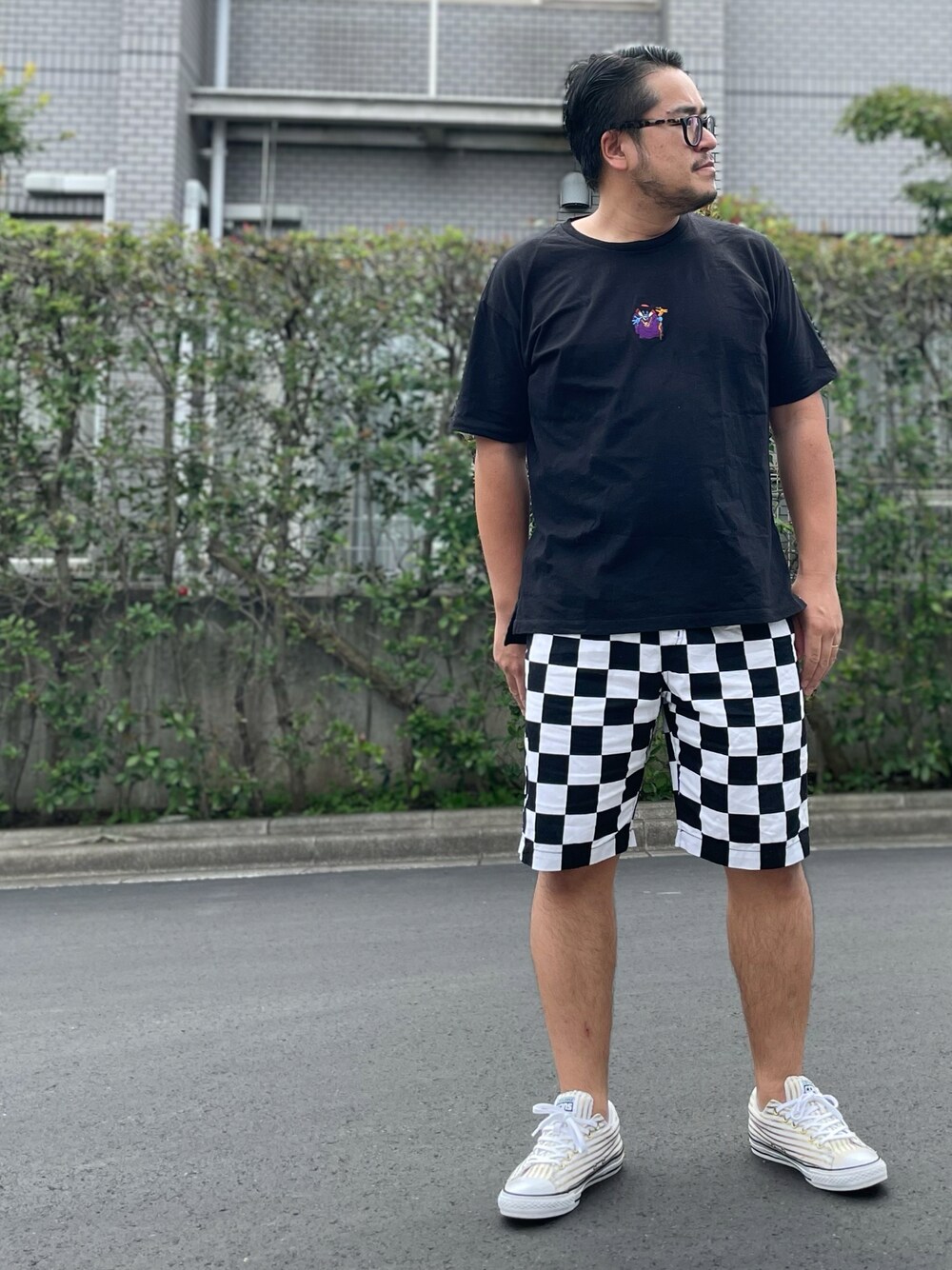 グラニフの竜王Tシャツ、 しまむらの半ズボン、 フラグメントのコンバース。