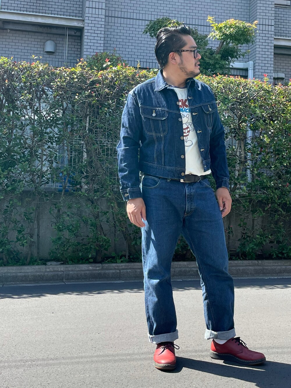 リアルマッコイズ×リーのジージャン、 トイズマッコイのジーパン、 クリフメイヤーのTシャツ、 ドクターマーチン 、 ドゥニームのベルト。