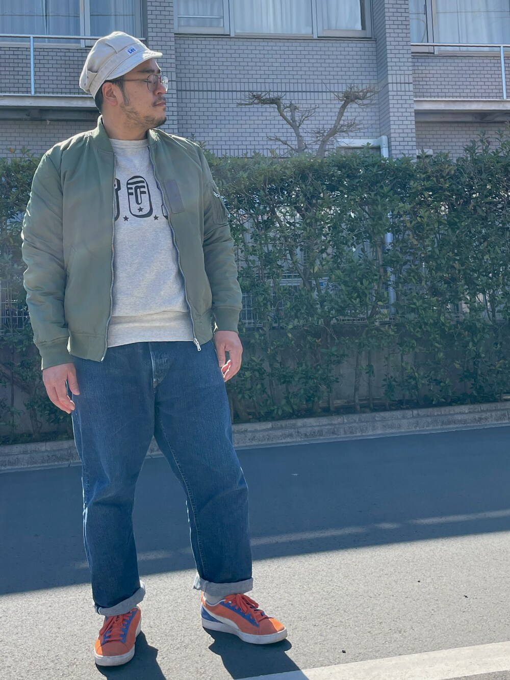 リーの帽子、 アルファのスカジャンの裏側l-2、 ダブルワークスのスウェット、 フルカウントのジーパン、 プーマのスエード。