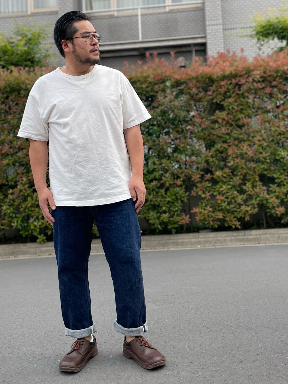 アヘヘのTシャツ、 シュガーケーンのジーパン、 ビルケンのダービー。