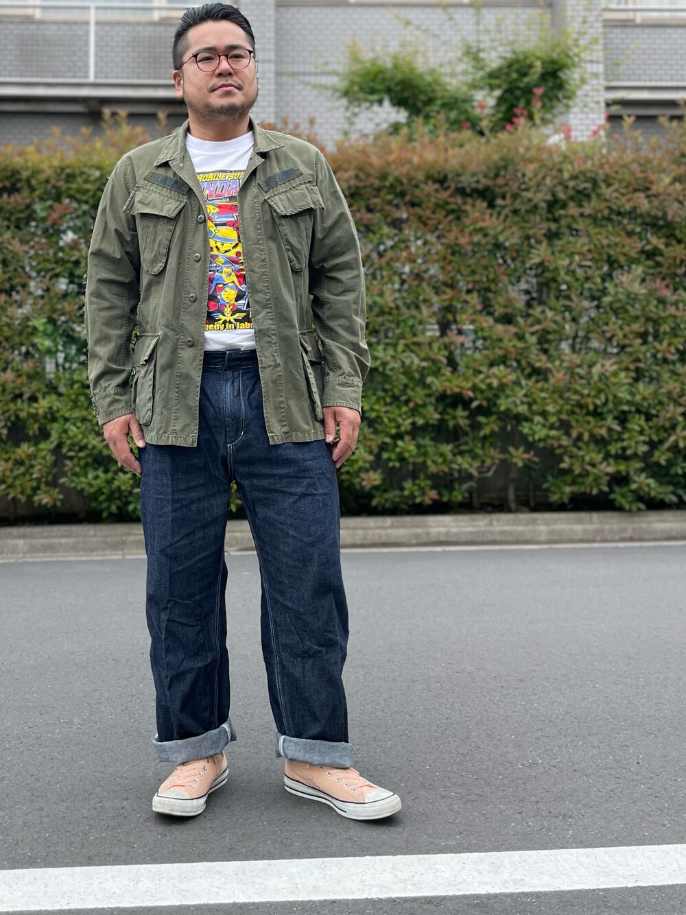 アヴィレックスのファティーグシャツ、 ガンダムのTシャツ、 ショットのデニムトラウザー、 コンバースオールスター。