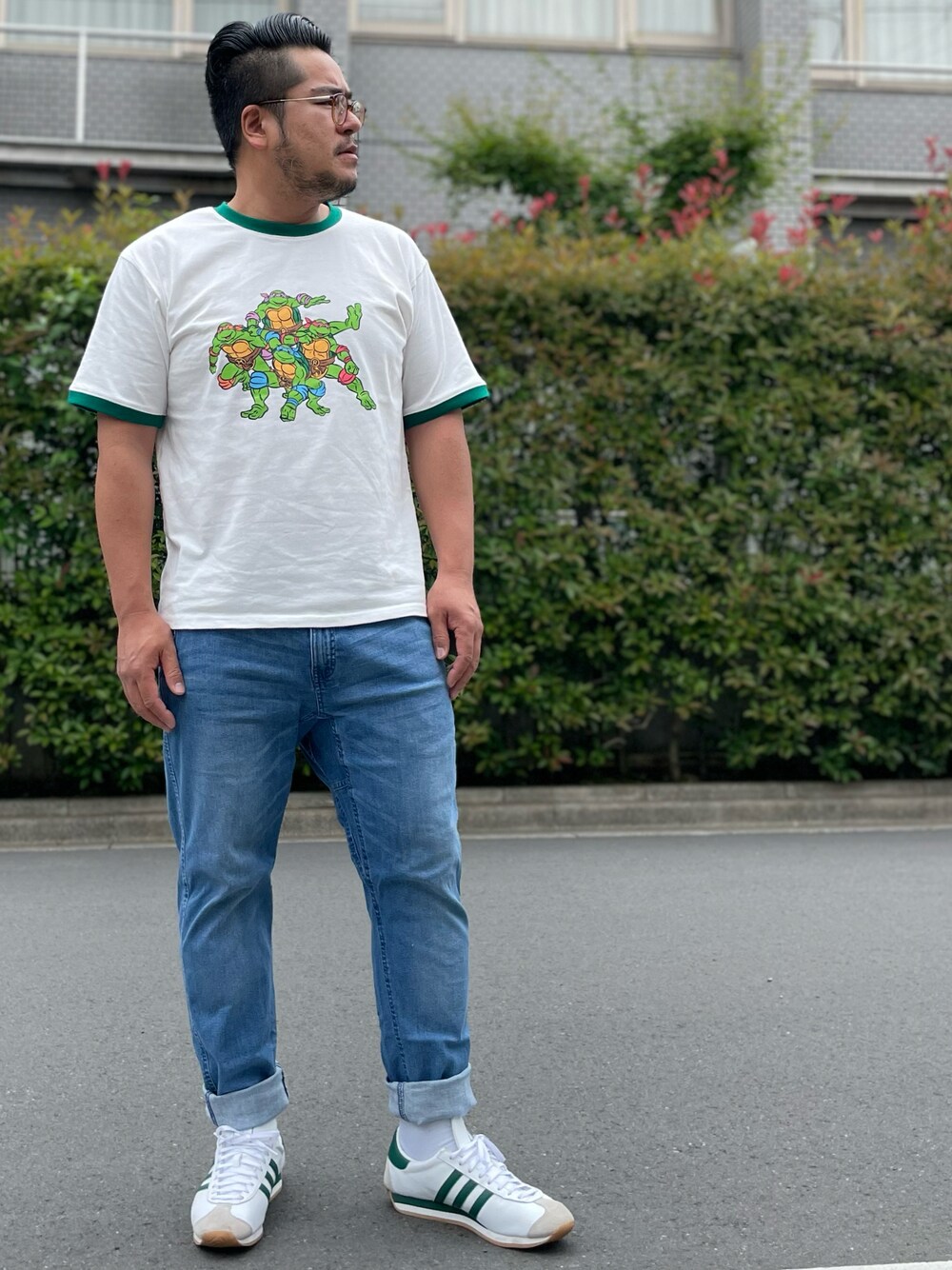 タートルズのTシャツ、 ジェリーのクライミングパンツ、 アディダスのカントリー。