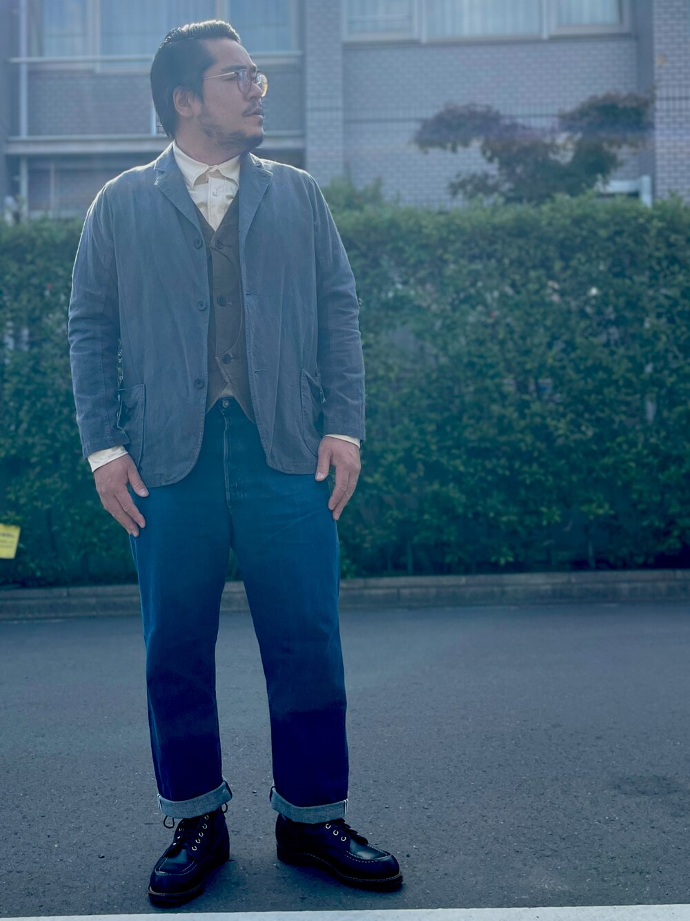 ワーカーズのジャケット、 フェローズのワークシャツ、ベスト、 リーバイスの1890モデル、 レッドウィングのハンツマン。