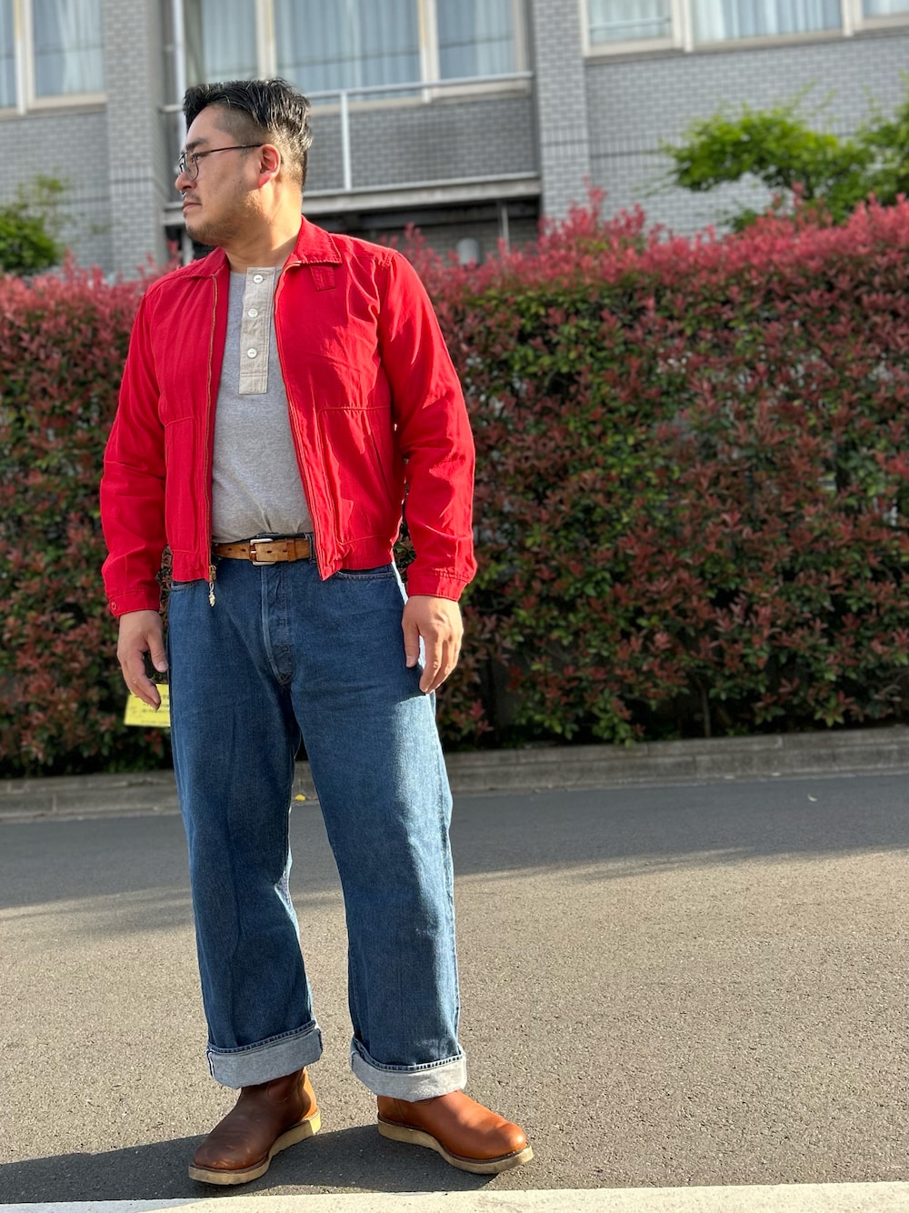 リアルマッコイズのマクレガーのドリズラー、 フェローズのヘンリーTシャツ、 フルカウントのジーパン、 レッドウィングのペコスブーツ。