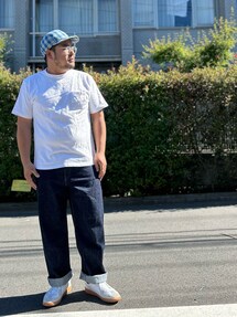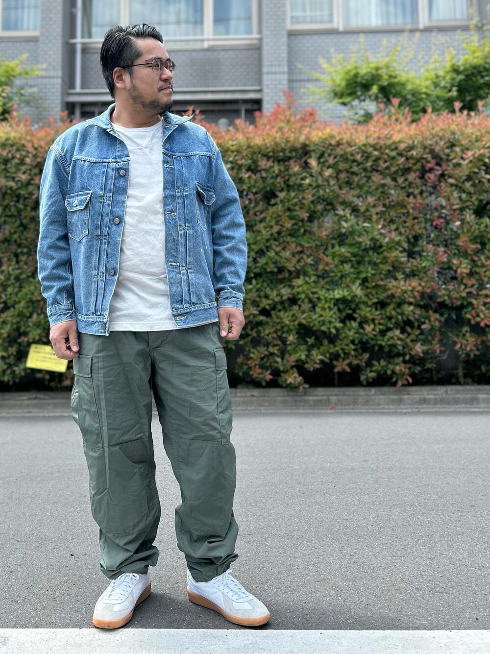 シュガーケーンのジージャン、 アヘヘのTシャツ、 プロッパーのカーゴパンツ、 プーマのアーミートレーナー。