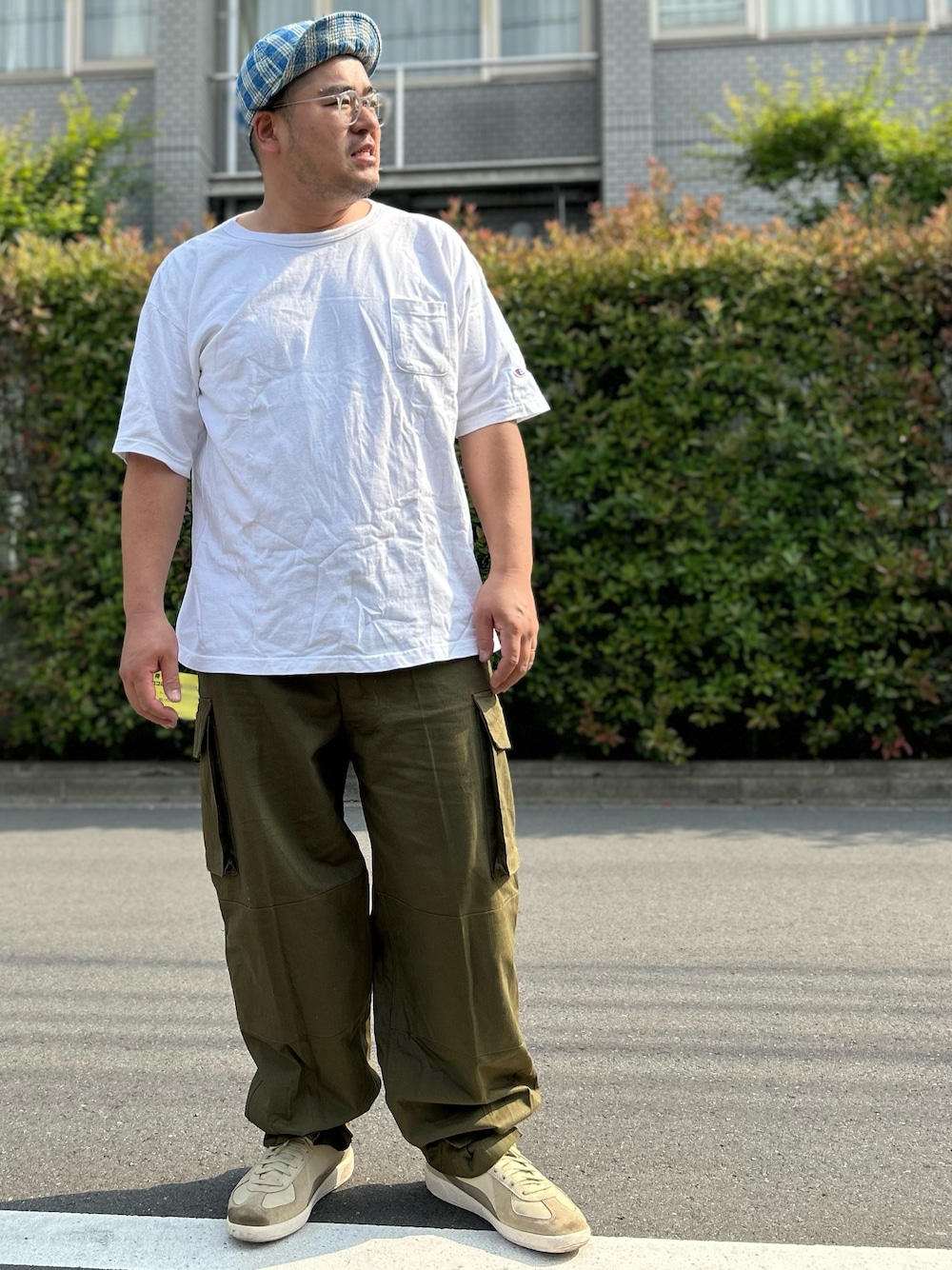 フルカウントの帽子、 チャンピオンのポケットTシャツ、 ヒューストンのカーゴパンツ、 プーマのアーミートレーナー。 久々にチャンピオンのTシャツを出したらシワシワでした😅