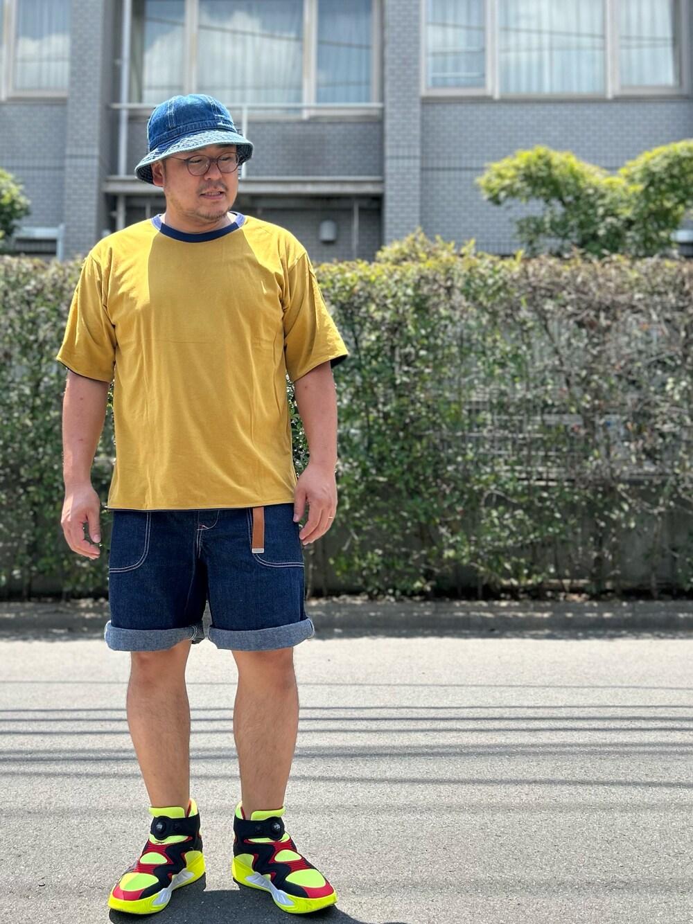 デニムのハット、 ナノユニバースのリバーシブルTシャツ、 リアルマッコイズのデニム半ズボン、 リーボックのポンプフューリーゾーン、 ワイルドシングスのベルト。