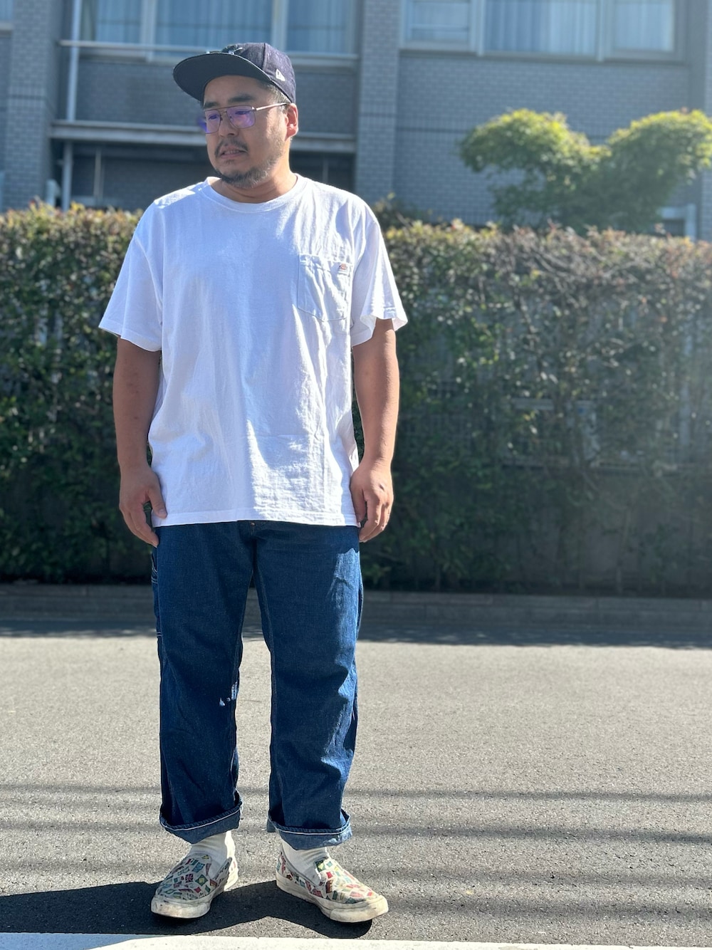 ポパイのニューエラ、 ディッキーズのTシャツ、 ドゥニームのペインター、 コンバースのスリッポン。