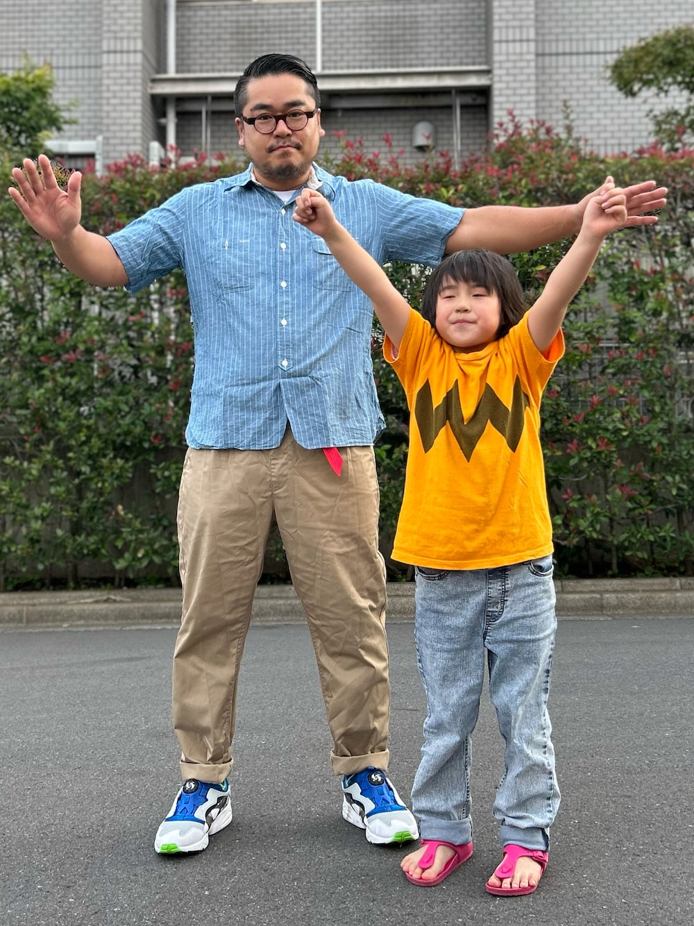 娘と。 まだ、衣替えが微妙ですね😵 ジャイアンTシャツ、お兄ちゃんのお下がりですが気に入ってくれているようです😊