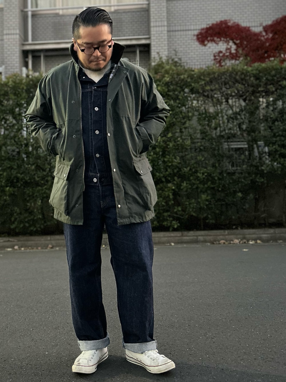 ロックオールのワックスドコットンジャケット、 スペルバウンドのジージャン、ジーパン、 ヘインズのヘンリーサーマル、 コンバースのオールスター。