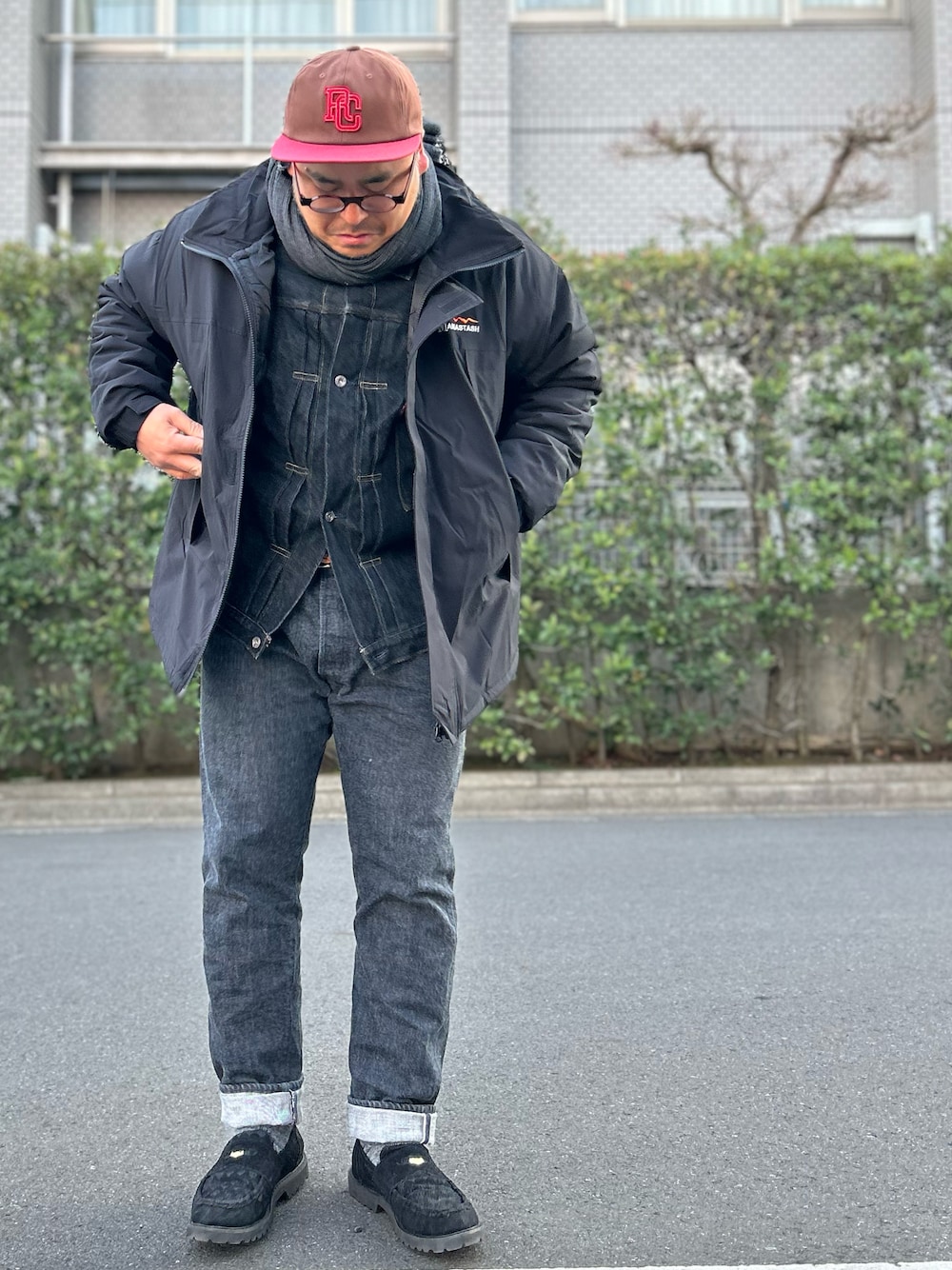 エベッツフィールドフランネルのシャア帽子、 マナスタッシュのジャケット、 インテリムのジージャン、 ワーカーズのブラックデニム、 ABCマートのジオン軍ローファー、 ジェラードのマフラー。